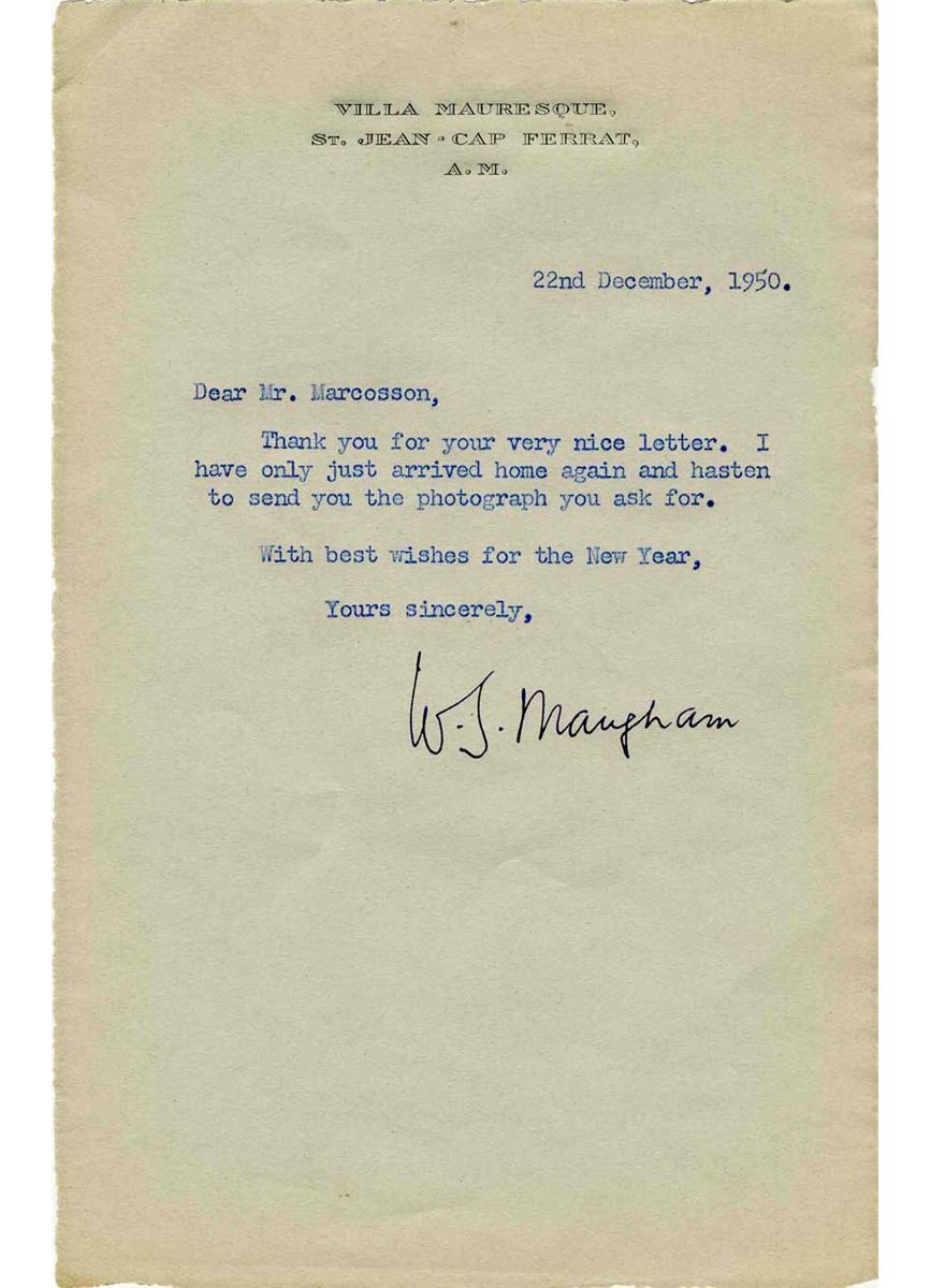 Acclaimed British author W. Somerset Maugham typed letter signed on ''Villa Mauresque'' stationery, dated 22 December 1950. Addressed to a Mr. Marcosson, letter reads in part, ''...I have only just arrived home again and hasten to send you the photograph you ask for...'' Signed ''W.J. Maugham'' in black ink. Measures 5.25'' x 8.25'' on one page. Near fine.