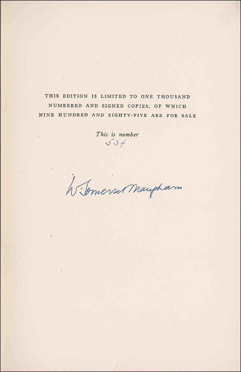 Signed book: A Writer’s Notebook. First edition, limited edition of 1000, this being 534. NY: Doubleday & Company, Inc., 1949. Hardcover with slipcase, 7 x 10, 367 pages. Signed in blue ink on the limitations page, “W. Somerset Maugham.” Uniform strip of sunning to the spine, slight separation from the front hinge, a few spots of toning along the top edges of the first few pages, and a rough edge to page 13, otherwise fine condition. Slipcase in very good condition, with heavy paper loss bordering on separation to the edges, with surface rubbing to the front cover.