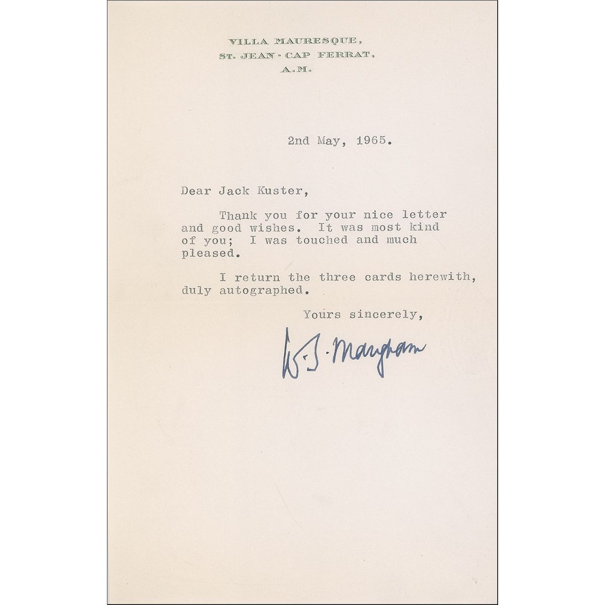 TLS signed “W. S. Maugham,” one page, 5.25 x 8, Villa Mauresque letterhead, May 2, 1965. Short letter of thanks to an admirer. In part: “Thank you for your nice letter and good wishes. It was most kind of you; I was touched and much pleased.” In fine condition, with a couple trivial creases and wrinkles.