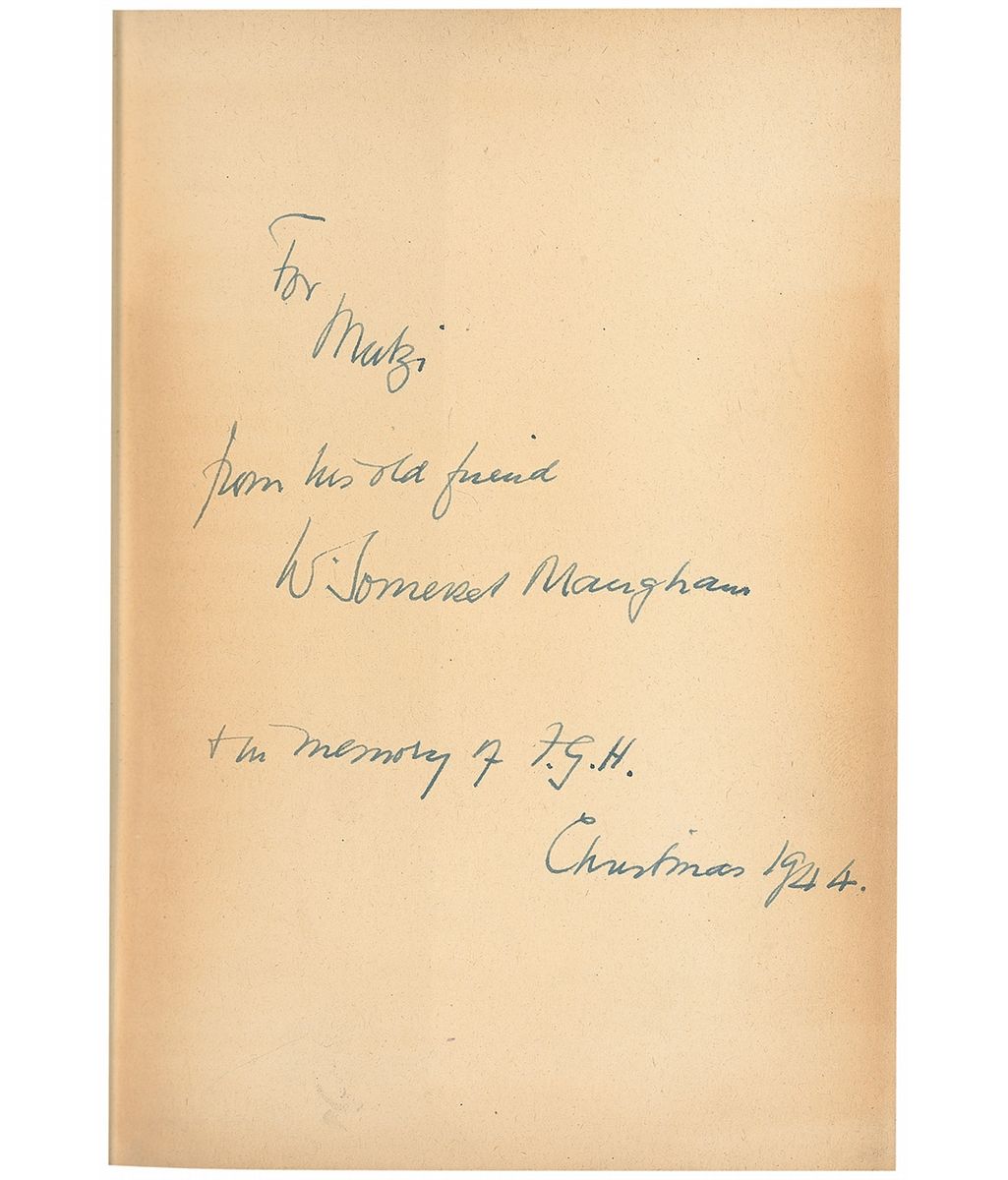 Signed book: The Razor’s Edge. Later printing. NY: Doubleday, Doran, and Company, 1944. Hardcover, 5.75 x 8, 250 pages. Signed and inscribed on the first free end page, “For Mazi from his old friend W. Somerset Maugham, & in memory of F. G. H., Christmas 1944.” In very good condition, with toning to signed page, loose but intact front hinge, light toning to fore-edges, and dings to head and tail of spine.