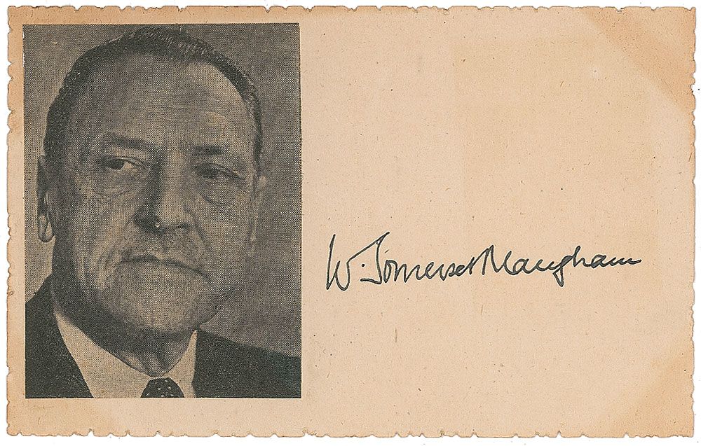 Fountain pen signature, “W. Somerset Maugham,” on an off-white 5.5 x 3.5 card bearing an affixed newspaper photo of the author. Reverse bears a collector’s notation indicating that the signature was received on August 19, 1947. Scattered toning, otherwise fine condition.