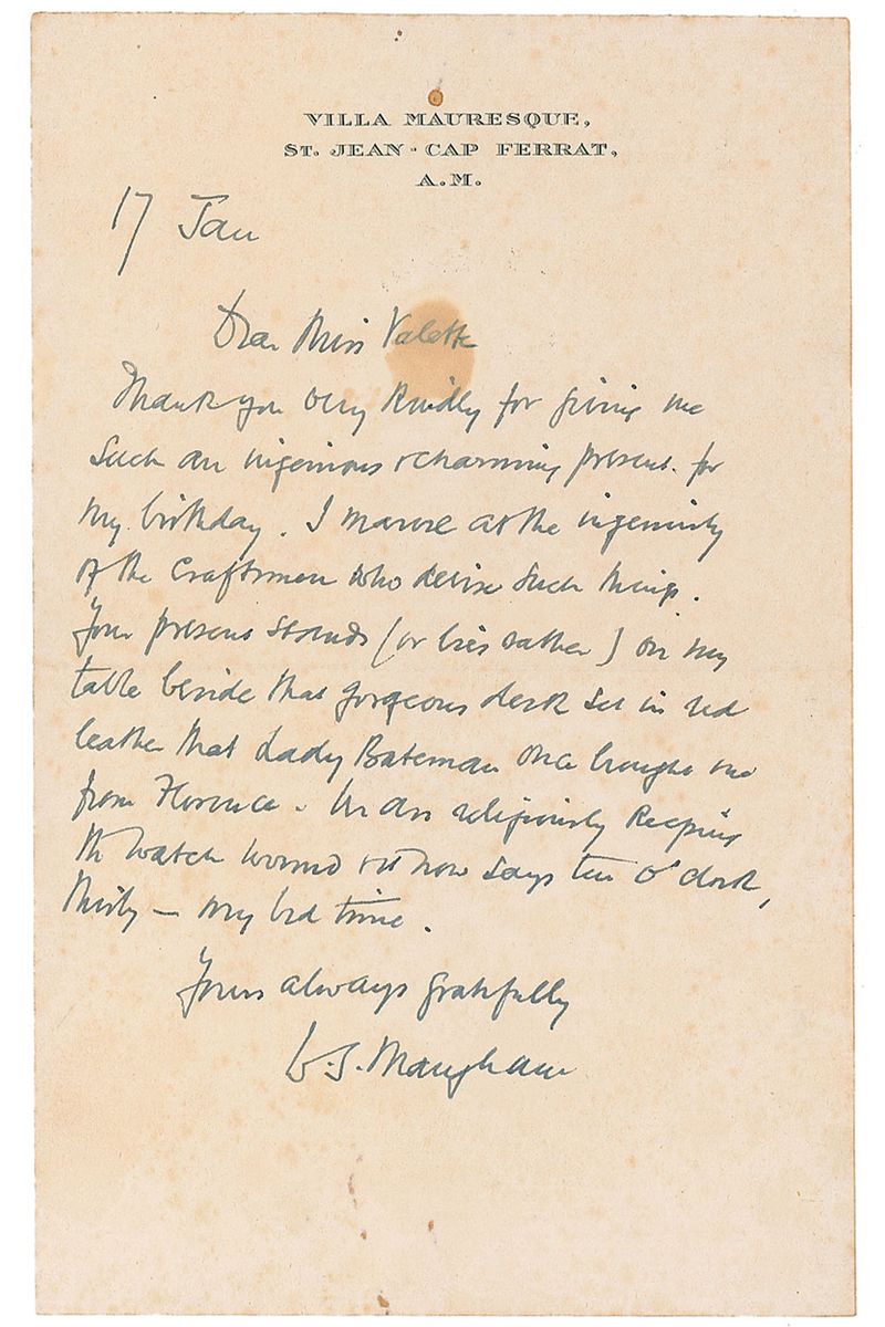 ALS signed “W. S. Maugham,” one page, 5 x 8.25, Villa Mauresque letterhead, January 17. Letter of thanks to a woman. In part: “Thank you very kindly for giving me such an ingenious & charming present for my birthday. I marvel at the ingenuity of the craftsmen who design such things.” In very good condition, with some mild toning and foxing, and a spot over greeting.