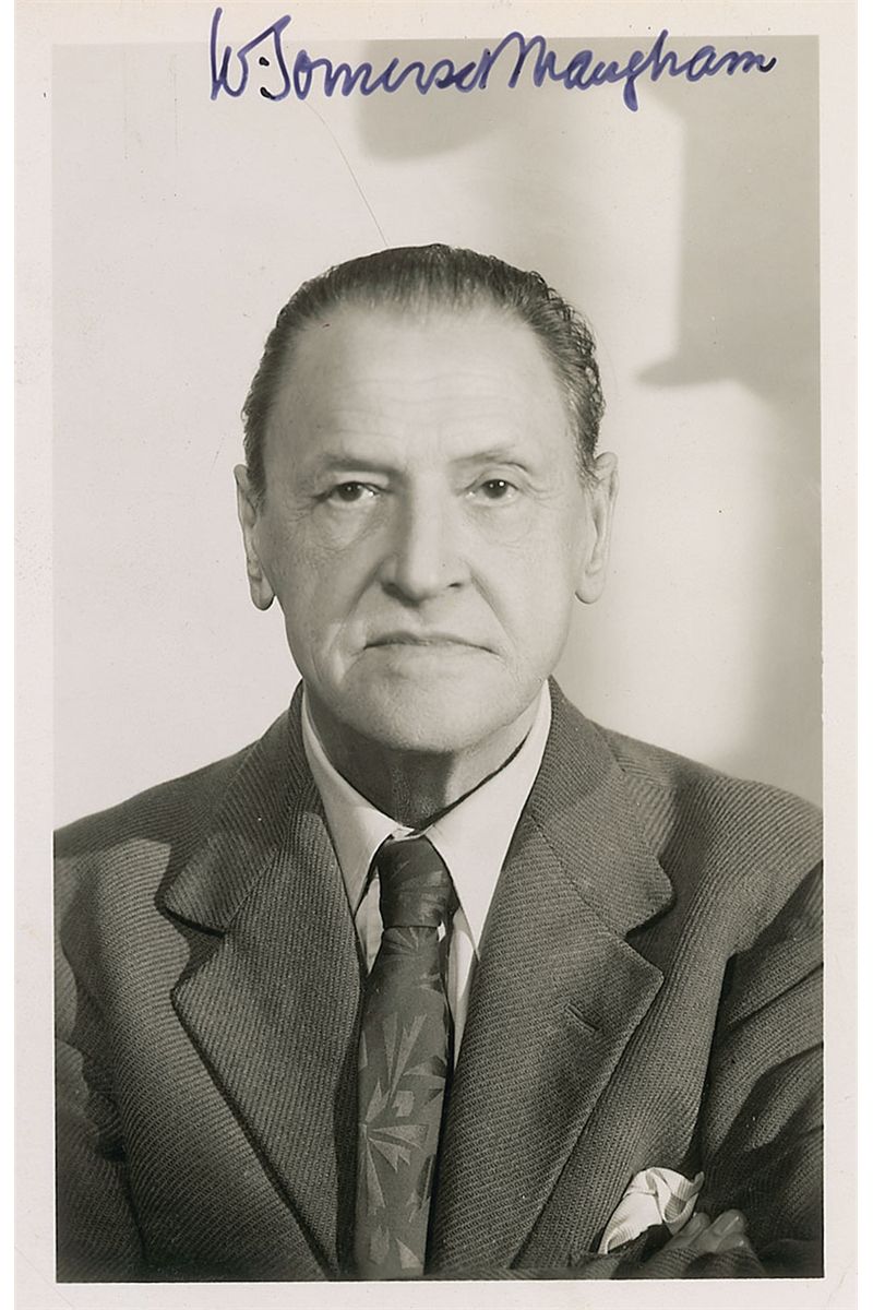 Vintage glossy 3.5 x 5.5 head-and-shoulders photo of Maugham in a suit and tie, boldly signed across the top in fountain pen. In fine condition, with a paperclip impression to the left of the signature.