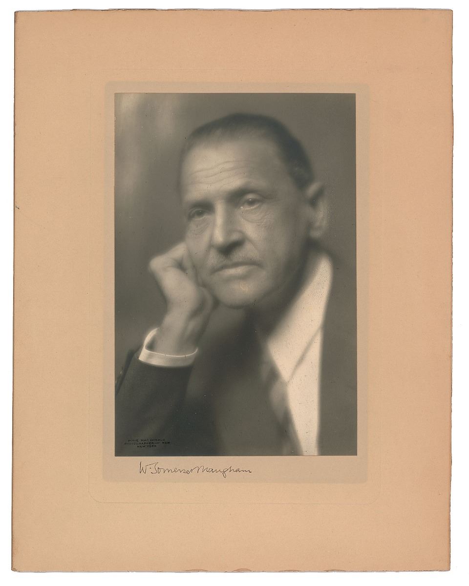 Exceptional vintage matte-finish 6 x 9 soft-focus portrait of Maugham by Pirie MacDonald of New York, affixed to its original 10.75 x 13.75 studio mount, signed on the mount in black ink. Reverse bears an ink notation dating the signature to June 2, 1947. In fine condition.