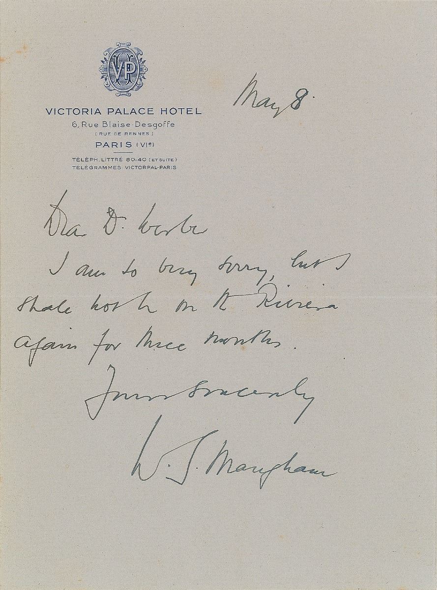 ALS signed “W. S. Maugham,” one page, 5.25 x 7, Victoria Palace Hotel letterhead, May 8, no year. In full: "I am so very sorry, but I shall not be on the Riviera again for three months." In fine condition.