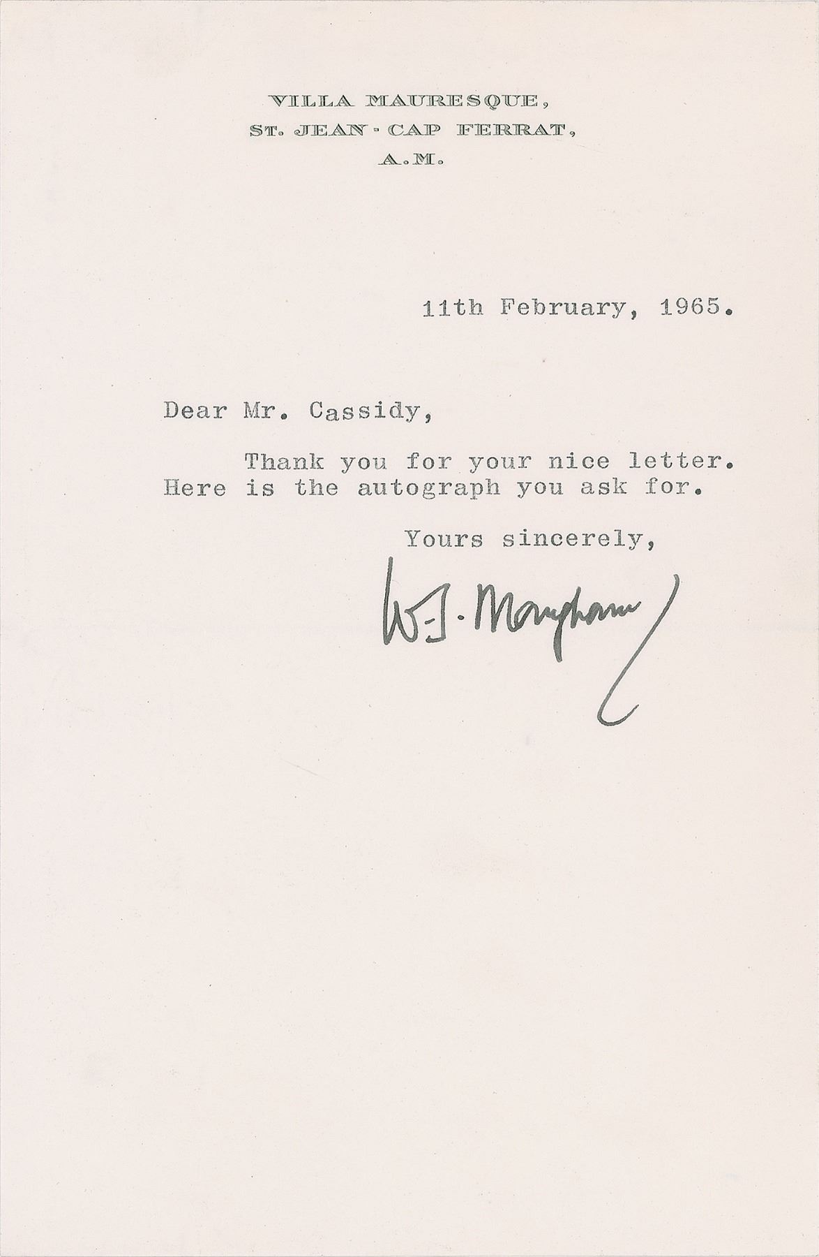 TLS signed "W. S. Maugham," one page, 5.25 x 8, Villa Mauresque letterhead, February 11, 1965. Response to a collector, in full: "Thank you for your nice letter. Here is the autograph you ask for." In fine condition.