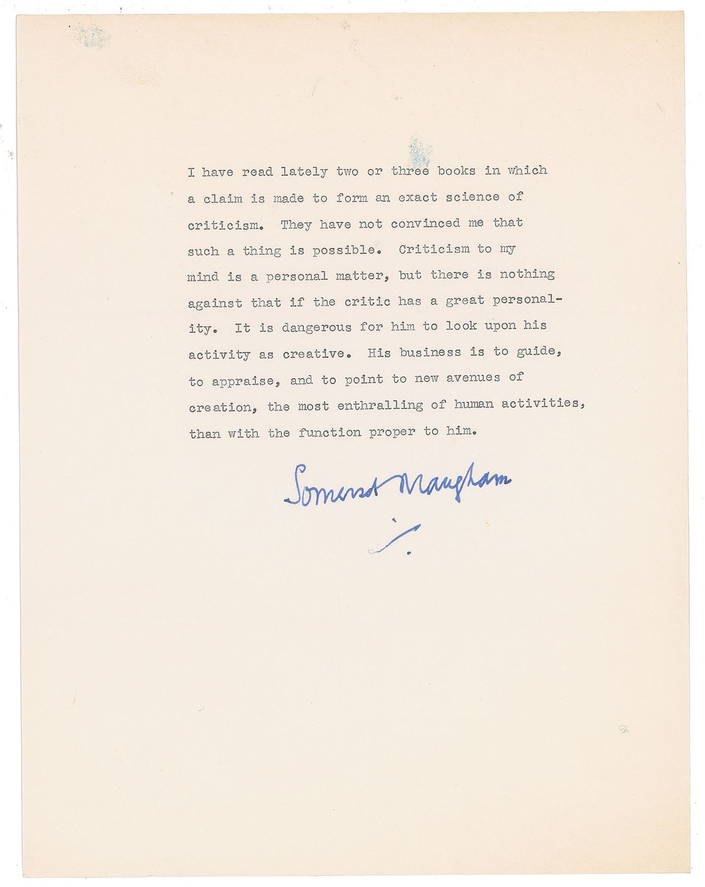 Souvenir typescript, one page, 8.5 x 11, signed at the bottom in fountain pen, "Somerset Maugham." An excerpt from The Summing Up, his literary memoir, in part: "I have read lately two or three books in which a claim is made to form an exact science of criticism. They have not convinced me that such a thing is possible. Criticism to my mind is a personal matter, but there is nothing against that if the critic has a great personality. It is dangerous for him to look upon his activity as creative. His business is to guide, to appraise, and to point to new avenues of creation, the most enthralling of human activities, than with the function proper to him." In fine condition. Accompanied by a small unsigned portrait of the author.
