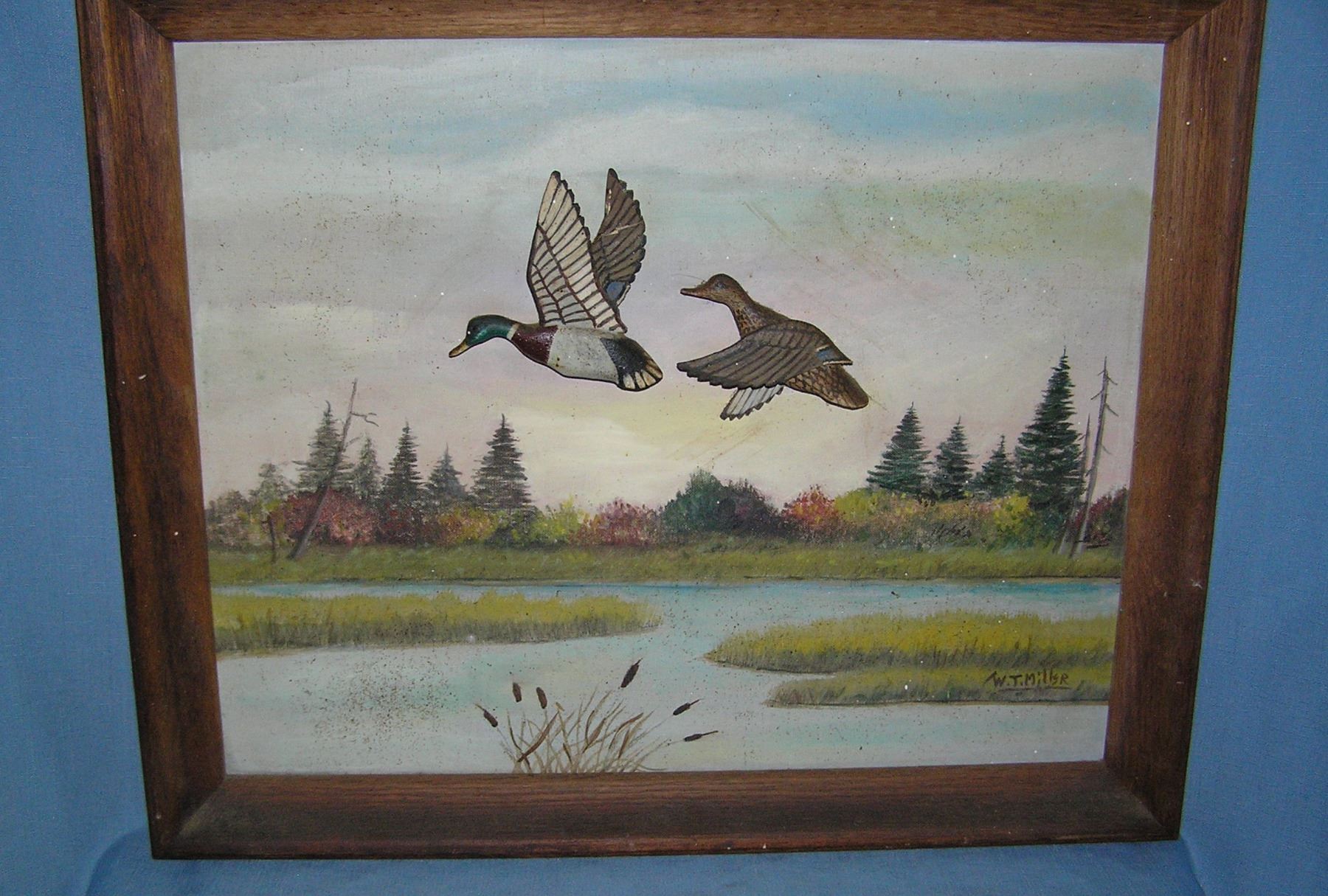 W. T. Miller artist signed Two Mallards oil on canvas board with a pair of applied carved ducks 17 inches by 21 inches with an oak frame est. value $500.00-$600.00