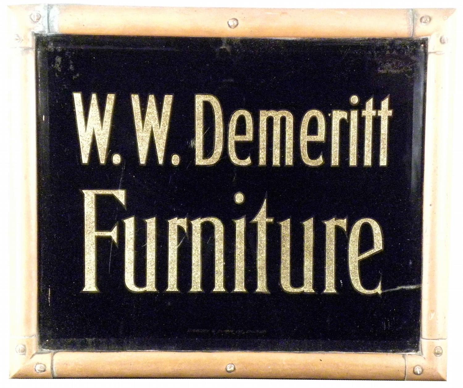 "W.W. Demeritt Furniture" Reverse Glass Sign. By Rossen & Evans. Gold leaf, beveled glass and large copper frame. Paint lifting in top corner and scratch at in the "E" in furniture. Good condition. 16 X 13 1/2 inches.