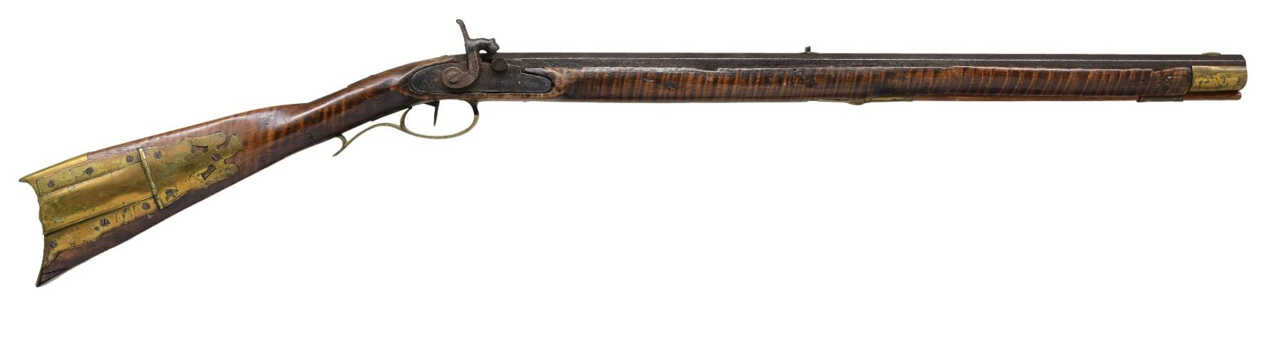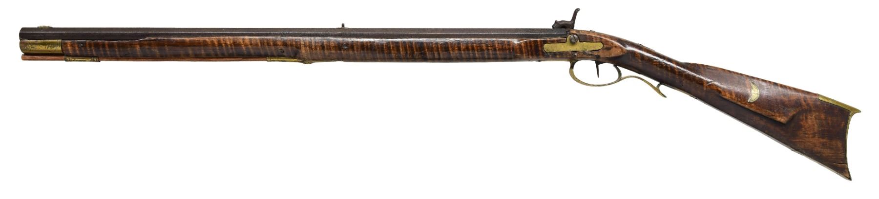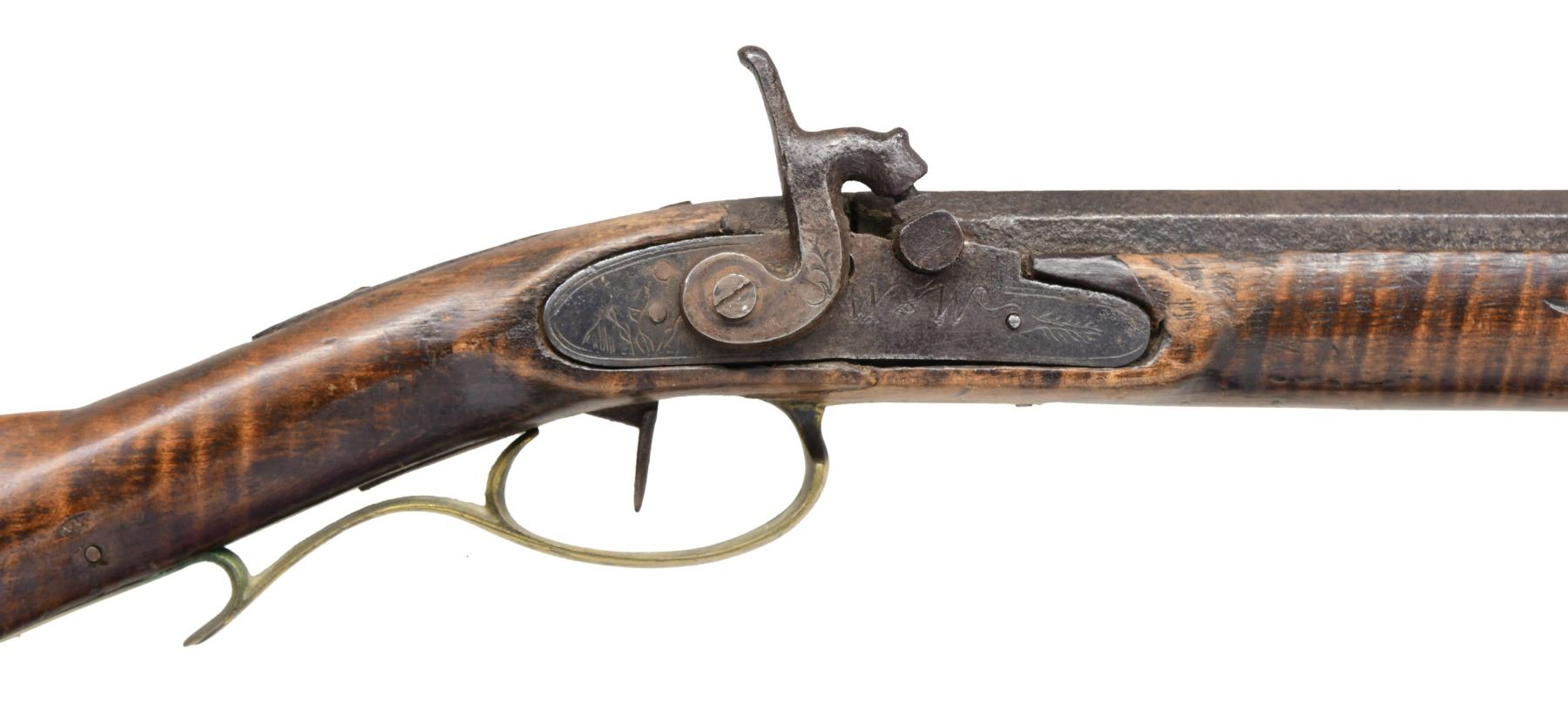 Cal. 45. NSN. The octagon 26" smoothbore barrel has a brass blade front sight and notch rear sight. The percussion conversion lock is engraved "W&W". Single trigger. Full-length, pinned maple stock. Brass furniture, including nose cap, ramrod pipe, thimble, sideplate, triggerguard, toeplate, crescent buttplate, and man in the moon on cheekpiece. CONDITION: barrel & lock have a brown patina appearance with corrosion and heavy pitting. Stock has a break through the right side forearm in front of the thimble, an epoxy repair, a missing chip on the right side tip of the forearm, epoxy repairs below the sideplate and through the trigger, and separation cracks at the toe. Stock has notable chips, large cracks, and gouges. Dark, pitted bore. (01-24314/MD). ANTIQUE. $600-800.