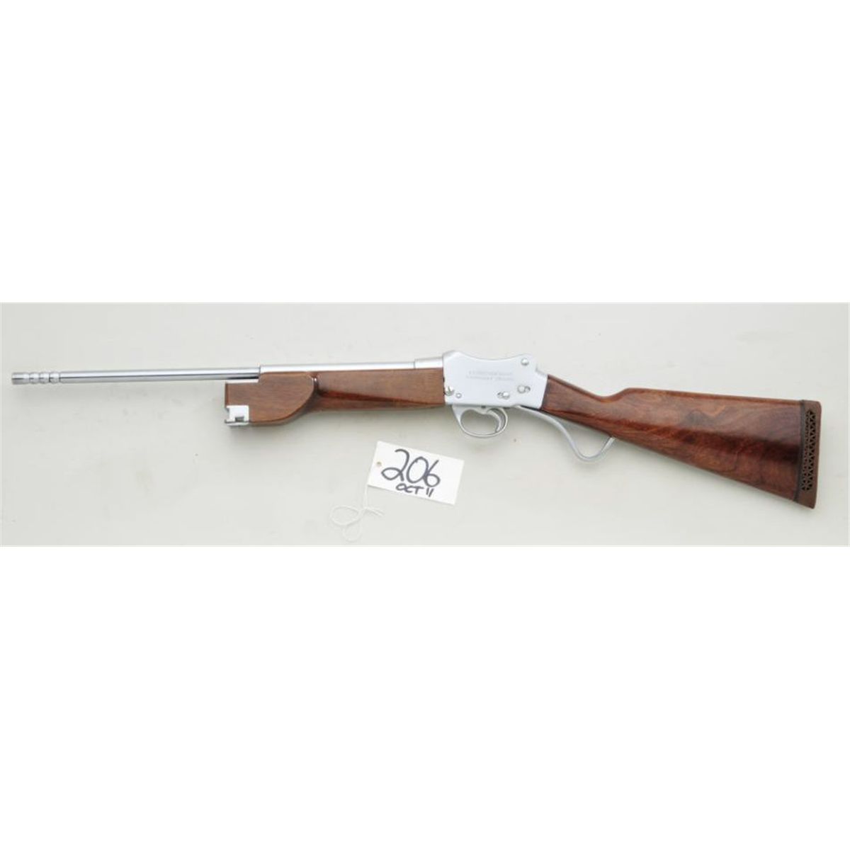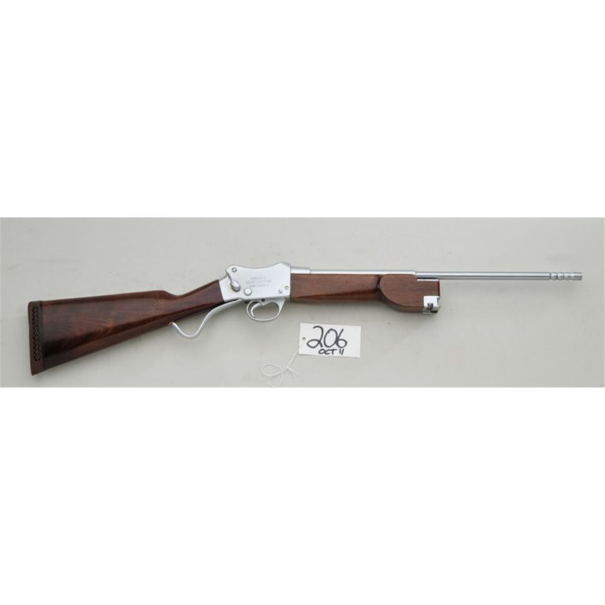 W.W. Greener Martini-Henry action, special conversion to line-throwing gun. Right side of frame marked “Greener’s Light Harpoon Gun Mark 2”. The gun shows a nickel of which most remains, serial #H71926. Stocks are fine toexcellent with a couple of minor scratches and mars. Old hardrubber recoil pad is deteriorating. Marked “For .38 special blank”. 36-1/2” overall, 19-1/2” barrel. No harpoon or accessories. Very good plus tonear fine condition. From the Robert Petersen collection. Est: $600 - $1,200