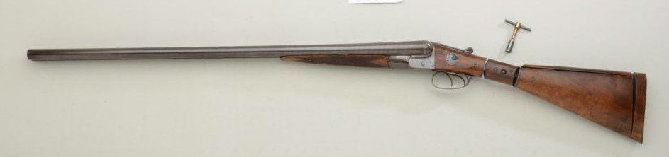 W. W. Greener factory demonstrator or "try" gun, serial #46612. The gun shows 28-1/8" Damascus pattern barrels that are browned with a case hardened action. Nearly all the original finish remains on the barrel, justtoning slightly; 30-50% case hardening on locks, 30-50% thinning blue on trigger guard and floor plate and plate at bottom of action. The gun shows standard extractors, the bores are excellent, the gun is chokedcylinder right, full left. The stock is in good condition with some minor dings, mars and handling; an original butt plate is retained and the gun shows Greener type side safety and double triggers. Stock is fullyarticulated and adjustable and a key is used for adjustment, which is also included. The barrel shows address W. W. Greener, 68 Haymarket, London with W. W. Greener on each side of action. The action is tight, thebores are excellent; the gun is choked cylinder right, full left; and shows black powder proofs. A good collector's item and also very practical for dealer use. Est.: $2,500-$5,000