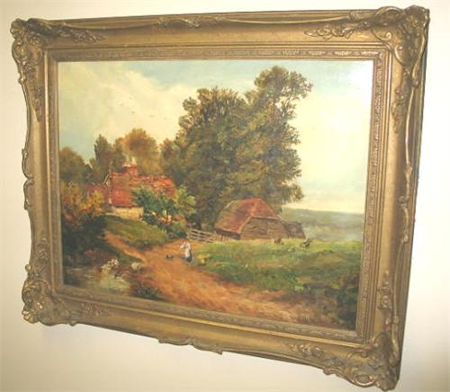 W. WAKEFIELD 23"X28" FARM SCENE PAINTING ON CANVAS (CRACKS IN FRAME)
