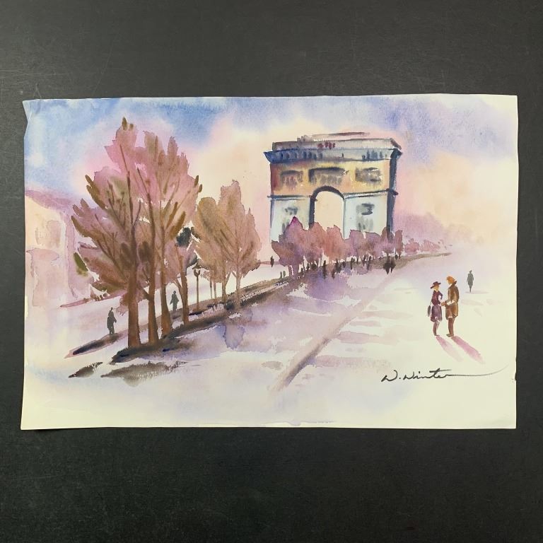 W. Winter's "Princes' Gates" original print. This piece is of a pathway with people walking, leading up to the Princes' Gates at Exhibition Place in Toronto, Ontario, Canada, and has been done in a watercolour style. This piece is is in good condition with a few very minor creases, and some damage to upper left corner.