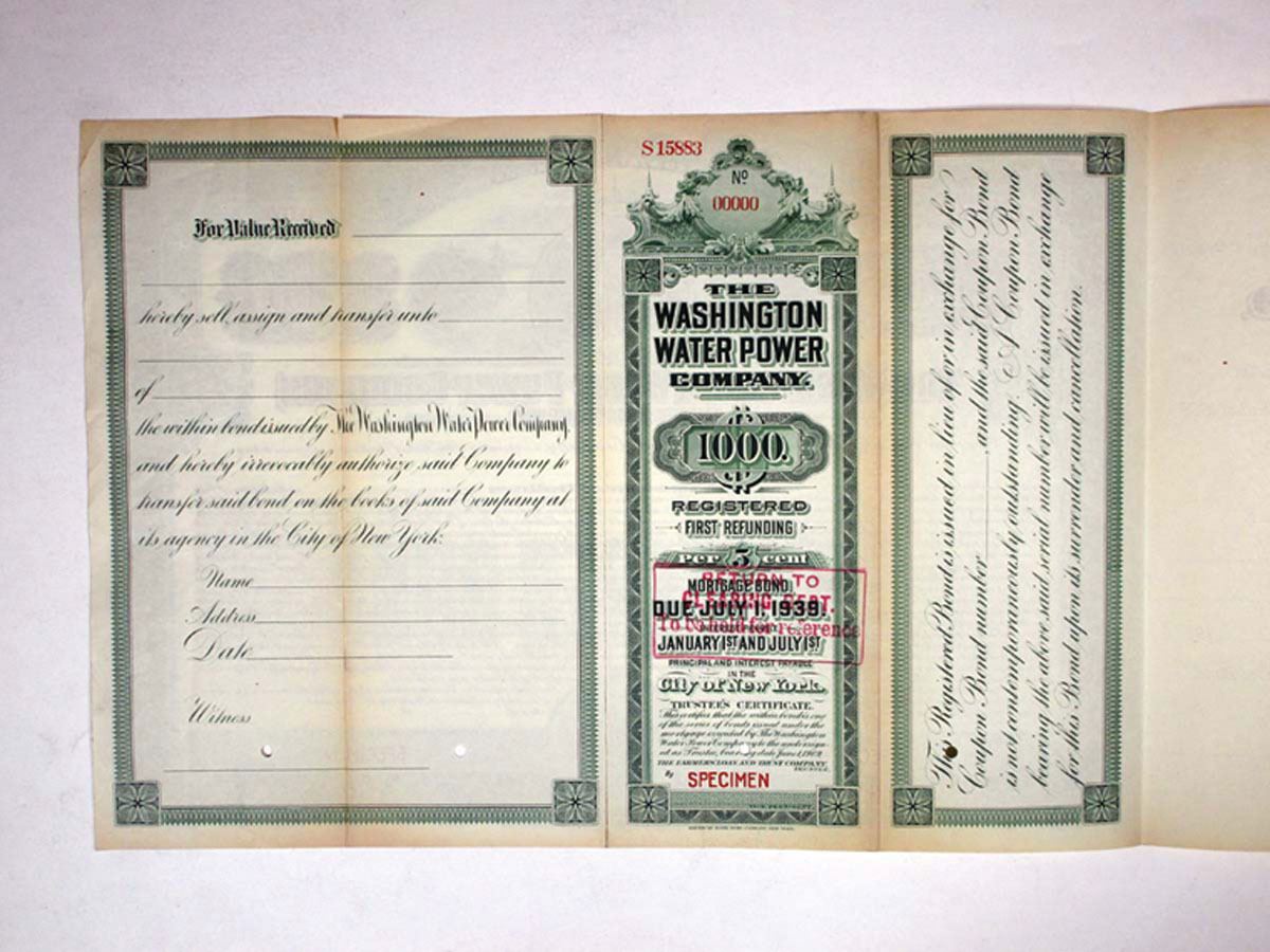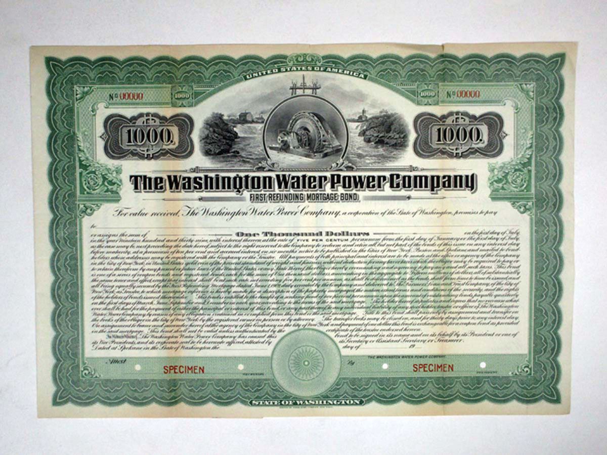 WA. The Washington Water Power Co., 1909 Registered 1000$ Bond, VF-XF ABNC