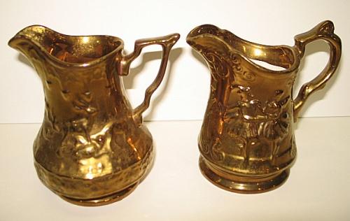 PAIR OF GEORGE WADE COPPER LUSTER CREAMERS. Consists of one creamer with relief stag decoration around body. 5.75" H. Also consists of one creamer that is relief decorated around body with two ballet dancers. 5.5" H. Both are marked on bottom.