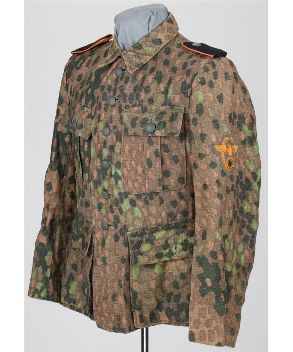 Extremely rare Waffen-SS Field Gendarmerie camouflage jacket in fall "pea dot" camouflage pattern, 23" tall, button-on shoulderboards with appropriate orange piping and grey pebbled buttons, the cotton jacket six similar buttons attached to the garment with metal eyes. Four pockets with straight flaps are evident, two on each side, all unlined. A Feldgendarmerie patch, original to the garment, is sewn to the left sleeve, and both sleeves bear button closures. At one time, the jacket may have had a button-in lining, as three plastic buttons appear at the inside neckline. Within, the jacket is unlined, but suspender hooks, an interior pocket, and triple ventilation holes are all present. A single ventilation slit is present at rear. In near unissued condition. SS-Feldgendarmerie controlled rear areas but also conducted counter-insurgency and extermination operations with einsatzgruppen against Jews, partisans and those deemed to be "enemies of the Reich". These SS units had a severe reputation for being strict enforcers of military law. Nicknamed Kopf Jäger ("Head Hunters"), they also tracked down and punished those deemed to be deserters.