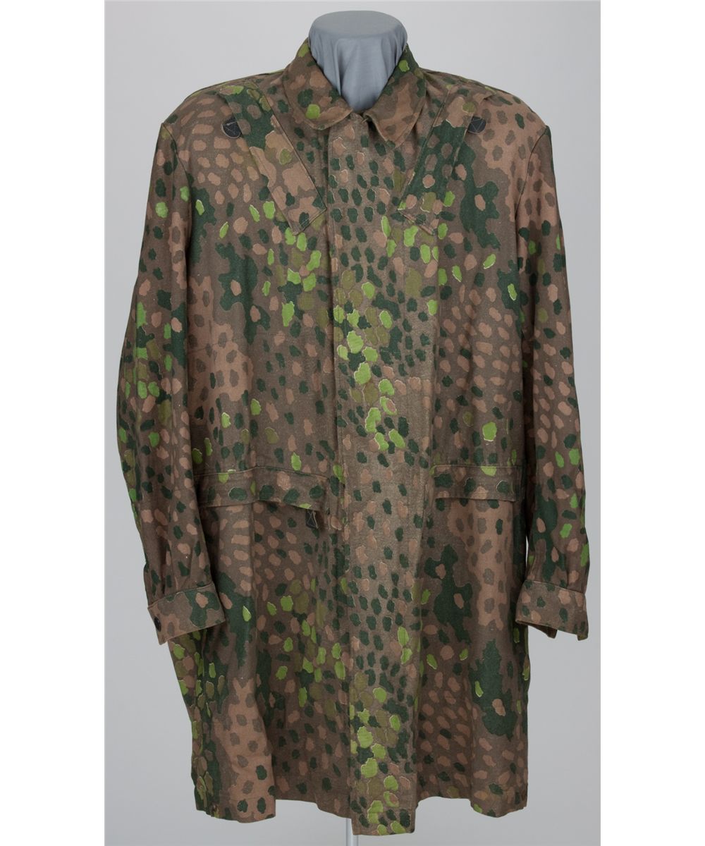 Likely the rarest of all SS-issued uniform items, a camouflage jump suit issued to an SS-Fallschirmjager Battalion member and intended for use in the event they would jump into action. The suit, printed in SS "pea dot" camo pattern, measures 36" tall with unbacked collar and four button closure. The left and right sides both bear a diagonal slash pocket with zipper leather tab closure at the shoulder, as well as a similar horizontal lower zippered pocket. Also present on both sides is a snap closure which cover three sewn vent holes. At right a broad 7" flap secured with two buttons was intended to secure a pistol or flare gun. A fabric loop is also sewn at rear. The sleeves bear ends which are lined with elasticized fabric with a snap closure, constructed to keep wind from inflating the garment during a parachute descent. Within, the garment is unlined and unmarked except for three numerical inspectors' marks. A drawstring is integrated into the garment to fit it more closely to the wearer. Some oxidation to the snaps, else in near unissued condition. While SS camouflage jackets, gloves, and other items remain obtainable, some items are simply no longer extant - this may be one of the the last example of this jump suit available.