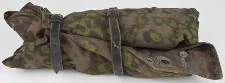 Waffen-SS Oakleaf "A" pattern "zeltbahn", a tent quarter or poncho in camouflage splinter pattern, with buttons, buttonholes and grommets, maker's mark indistinguishable. As always, the fabric is printed with a winter and spring foliage pattern on either side. With matching black leather rucksack straps. One or two buttons missing, two field repairs to very small tears, else very good. The zeltbahn or tent quarter was a multi-purpose piece of German army regulation equipment that was issued to ground forces. This piece of camouflaged material could be combined to make tents or shelters of various sizes as well as for camouflage, ponchos or stretchers.