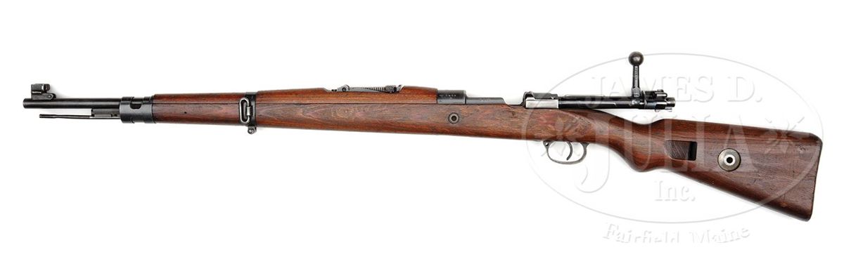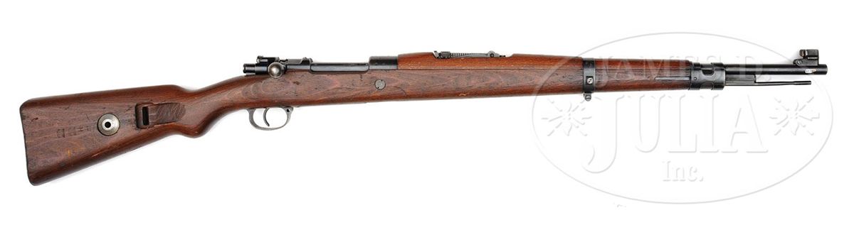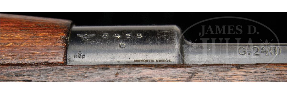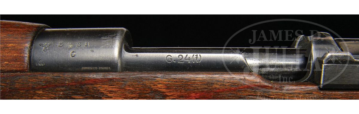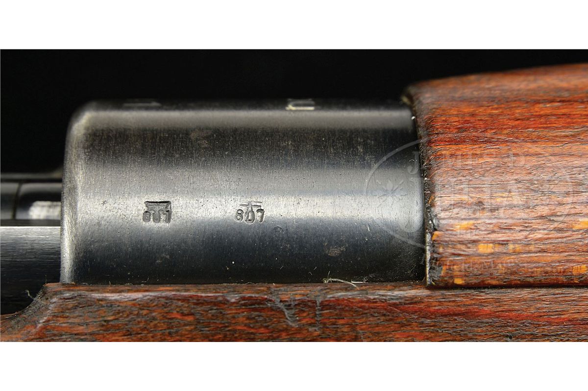 SN 5438C. Cal. 8mm. Hard to find G24(t) made in Czechoslovakia under German supervision 1941. All metal parts are matching where they should be with the exception of the magazine follower, which is marked WaA 214, SN 95. The top receiver is correctly marked "dou" and dated 41 with Nazi era firing proof as well as tiny British proof on left side receiver. Laminated stock is serial numbered to the gun and nicely proofed. Eagle/H and WaA 607 on right butt. Overall nice example of scarce G24(T). PROVENANCE: Collection of Dr. Geoffrey Sturgess. CONDITION: Very good to excellent. Metal retains 95% orig bluing with wear on the high edges. Bore is very good to excellent. Stock shows few scuffs and dings. 4-53305 DW6