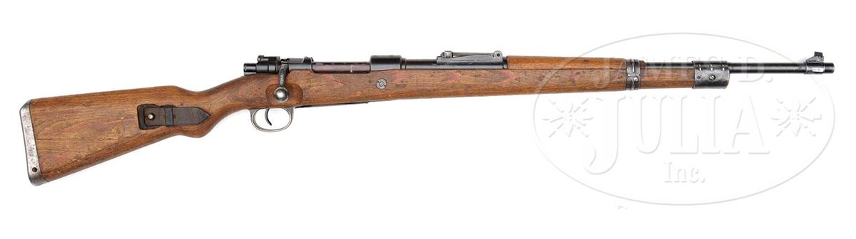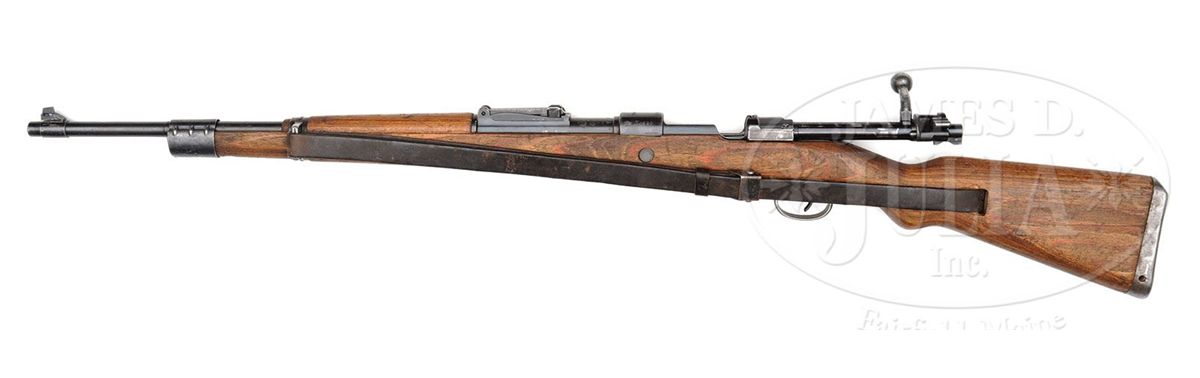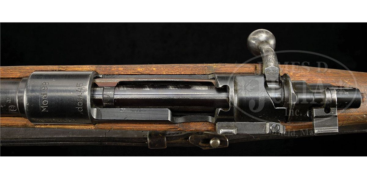 SN 4520. Cal. 8mm. Late WWII Kriegsmodell produced in Czechoslovakia under German occupation. Rifle is in standard Kriegsmodell configuration with stock screws on front and rear stock band, no takedown disc in the late laminate stock and has simple hole drilled through buttplate for bolt takedown. Metal parts are largely unnumbered with the exception of the receiver and bolt body. Top receiver marked "Mod.98" and "dou.45", and left bbl & receiver marked with British proofs and two other proofs struck out after the war. Comes with "L&F" marked wartime sling. Good example of last ditch K98 production. PROVENANCE: Collection of Dr. Geoffrey Sturgess. CONDITION: Good. Stock shows much use with dings and scuffs. Metal parts retain 95% bluing with most wear on the sharp edges of the front and rear bands. Bore is dark, fair with strong lands, but should clean up. 4-53187 DW11