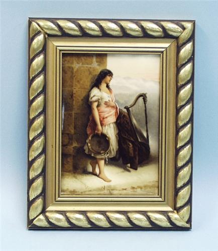 WAGNER - A 19th century Viennese porcelain plaque. Hand painted with the figure of a standing gypsy girl with a tambourine. Signed lower right. In gilt frame. 5" x 7".
