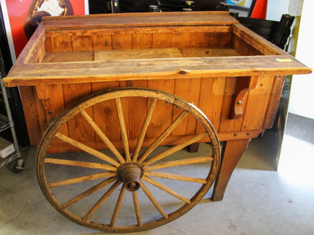 INSIDE STORAGE - 39" WIDE X 40" HIGH, WHEELS = WOOD/STEEL 37" DIAMETER.