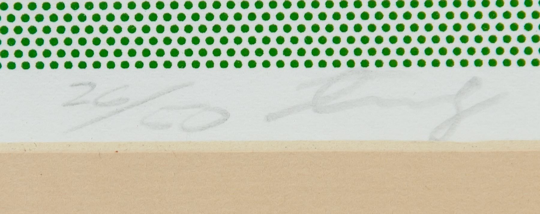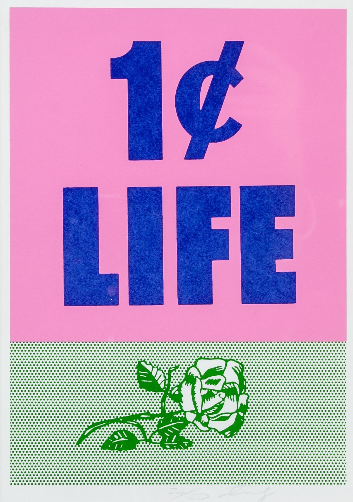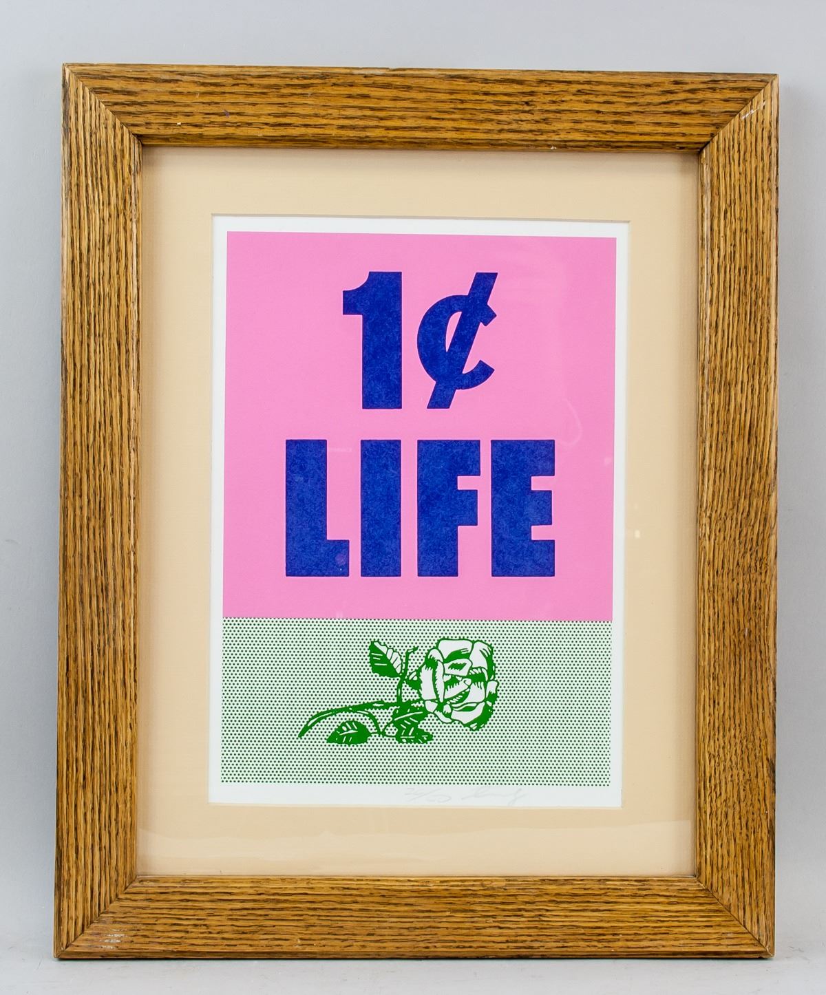 Limited edition screen print. Featuring in broad, bold letters, '1 cent LIFE." Signed and attr. Walasse Ting (Chinese, 1929-2010) on the lower edge with series 26/50 in pencil. 28.5 x 20 cm (11.2 x 7.9 inches). Walasse Ting was an American-Chinese artist known for his fluorescent colored paintings of cats, erotic nudes, and flowers. “Paintings are my honey, colors are my flowers, velocity is what’s required of a thief—he must paint as speedily as he draws a gun,” he once mused. Born Ding Xiongquan on October 13, 1929 in Wuxi, China, though largely self-taught, Ting briefly attended the Art Academy in Shanghai. Moving to Paris in 1952, he made the acquaintance of many of the members of the CoBrA movement, namely Karel Appel, Pierre Alechinsky, and Asger Jorn. Later in the 1950s, Ting moved to New York where immersed himself in the art scene, befriending Sam Francis and solidifying his association with Abstract Expressionism. During this period, he incorporated the bold strokes of traditional Chinese calligraphy into his practice. Finding critical acclaim, he was awarded the Guggenheim Fellowship in 1970. The artist died on May 17, 2010 in New York, NY at the age of 80. Today, his works are held in the collections of the Smithsonian American Art Museum in Washington, D.C., The Museum of Modern Art in New York, and the Norton Simon Museum in Pasadena, among others. PROVENANCE: Southern Ontario estate
