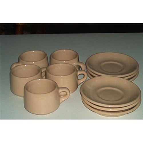 "Walker" China. Five cups and six plates. All in mint condition. Bottom of each piece are stamped in black: WALKER CHINA - TOLTEC - VITRIFIED - BEDFORD, OHIO. The coffee cups have have different numbers: D-51; D-61; Saucers numbers are: K-50; J-50. These numbers indicate the year they were manufactured. 1950, 1951, and 1961. Although the different numbers and dates, the cups and saucers match perfectly and all are in mint condition. This set contains 5 coffee cups and six plates.