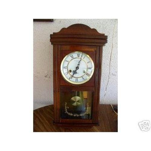 HERE'S A BRAND NEW KASSELL WALL CLOCK. IT IS MADE OF CHERRY WOOD. IT CHIMES ON THE 1/2 HOUR AND COUNTS OUT THE HOURS ON EACH HOUR. IT RUNS FOR 31 DAYS. KEY WOUND.