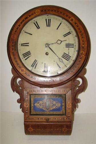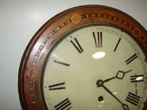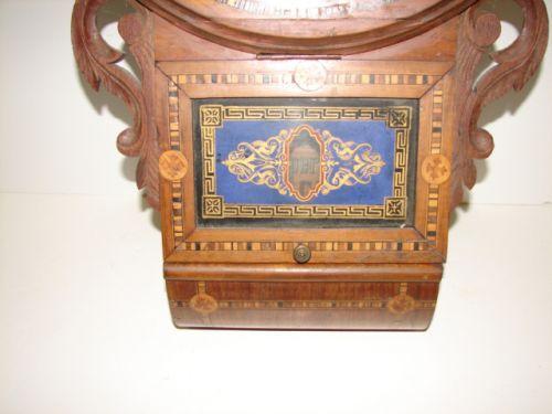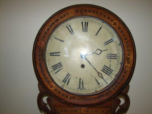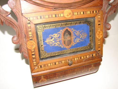 MARQUETRY INLAID WALL REGULATOR CLOCK. Elaborate veneer & marquetry inlaid decoration. Glass door at bottom opens upward to reveal label that reads “Superior/8 Day Clock/With Extra Bushed Movement/Warratned if Well Used/for/Home & Abroad”. Has key & pendulum. 27” H