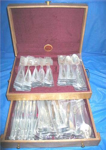 WALLACE (12-PLACE SETTING) FLATWARE SET (STERLING SILVER), TONGS, SERVING SPOONS & BUTTER KNIVES W/CASE (NEVER BEEN USED)