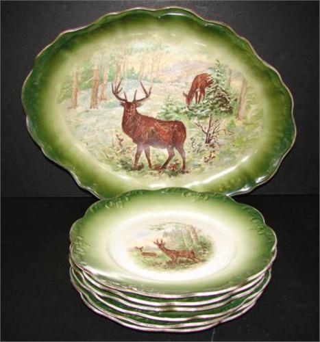 7 PIECE WALLACE & CHETWYND (1882-1901) PORCELAIN PLATE SET. Three plates are decorated with deer, two plates are decorated with birds, and one plate is decorated with rabbits. Platter is decorated with deer. All pieces are marked on reverse “Imperial Porcelain” with Wallace & Chetwynd mark. All pieces show signs of crazing. Plates: 8.5” Dia. Platter: 14” Dia.
