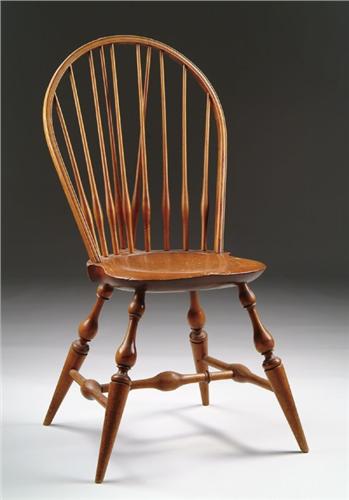 WALLACE NUTTING BRACE-BACK WINDSOR SIDE CHAIR. Branded ""Wallace Nutting"" with partial label, unmarked numbre but we believe this to be a 301. Light brown finish on a nicely formed brace back Windsor side chair. SIZE: 39in. h x 18in. seat h. CONDITION: Light scrapes to seat and some regluing, otherwise very good. 9-26024
