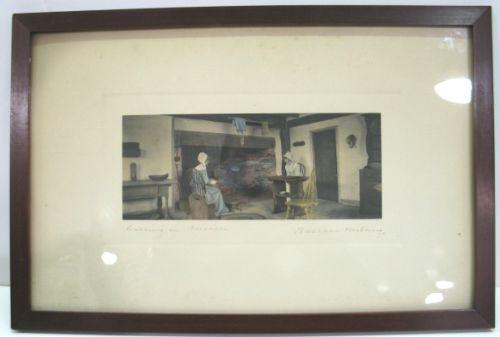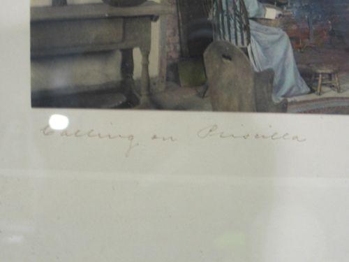 FRAMED WALLACE NUTTING INTERIOR PRINT. Depicts two females seated in kitchen. Titled “Calling on Priscilla” and signed in lower right. 18” x 12” framed.