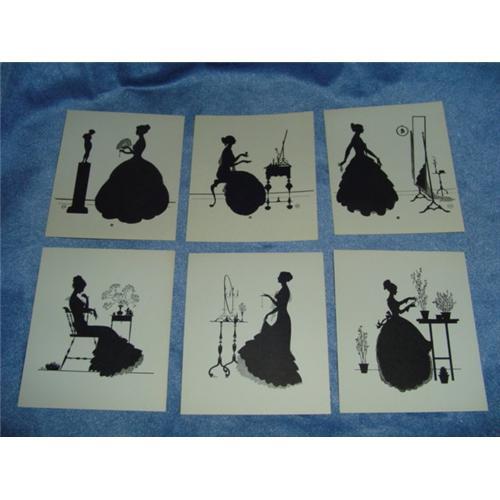 This is an authentic 3" x 4" W. N. SET OF 21 DIFFERENT WOMEN SILHOUETTES. Wallace Nutting introduced silhouettes in 1927. An assistant, Ernest John Donnelly (EJD), drew more than 30 different silhouettes. These silhouettes are machine produced copies of the original-pen type hand-done drawings by "EJD." Silhouettes of women typically have only one woman in them and represent both interior and exterior scenes. They are always marked in one of the three ways. Some have the "EDJ" in a circle, "(c) WN," and some carry both. Occasionally, the mark will be cropped off to fit a picture frame. Please see other individual W. N. silhouettes including Mr. & Mrs. Nutting (signing their Xmas cards), Unknown (famous people?) silhouettes (men & women), Mother's Day, Christmas, & Art Nouveau style Greeting Cards. NOTE: USPS FIRST CLASS SHIPPING & INSURANCE (USA) - $5.00.