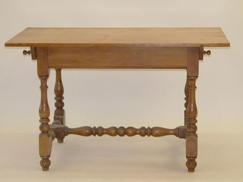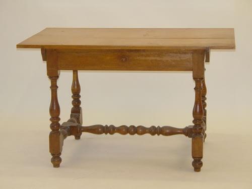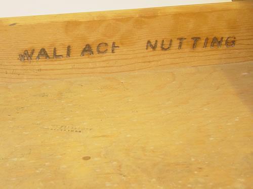 WALLACE NUTTING PA STYLE TAVERN TABLE - MAPLE W/ 1 DRAWER, OVERHANGING TOP, TURNED LEGS & MEDIAL STRETCHER, SIGNED WALLACE NUTTING W/ BRASS TAG (T 646 N.S.B.) & PAPER TAG (6846)(30.25"T X 36.5"W X 27.5"D)- MISSING 2 PEGS, WEAR, IMPERFECTIONS