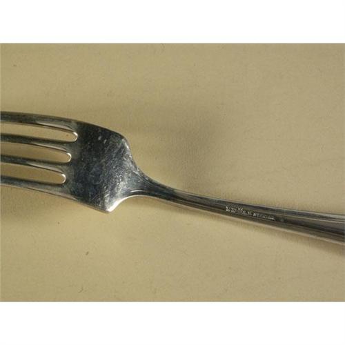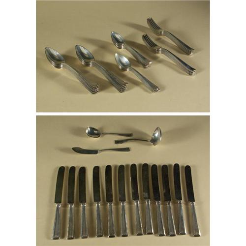 STERLING: A 51 piece set of Wallace Sterling Silver flatware, pattern is ''Cabot'', (1917-1965), consisting of 12 Old French hollow knife, stainless steel blade, 8.75'', 12 dinner forks 6.75'', 12 oval cream soup spoons 6.75'', 12 teaspoons 5.75'', flat butter spreader 5.5'' , sugar spoon 5.5'' and a gravy ladle 5.5'', 47.4 ozT excluding knives. Note: surface wear commensurate with age.