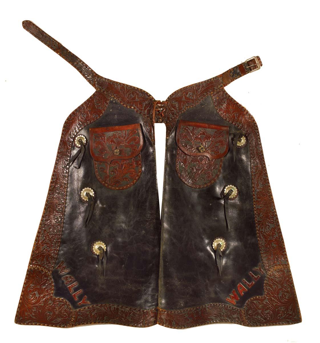 Black leather, fully lined batwings with floral carved, rawhide buckstitched, brown perimeter trim with heart-shaped corners, exterior pockets, six slotted 1 3/4" scalloped, domed prisonmade (Walla Walla?) conchos with latigo strings. Very decorative, good condition, c 1920s