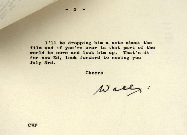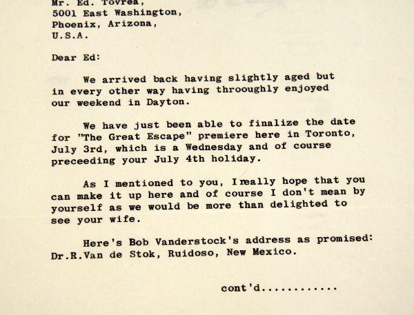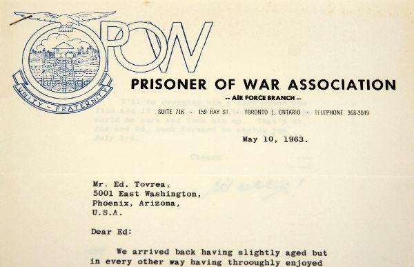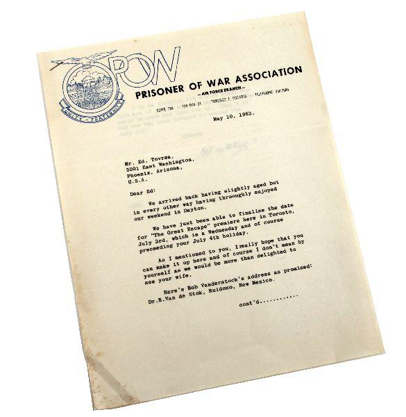 A letter from perhaps the most notable character in the book and film, the famous tunnel engineer of "Tom Dick and Harry" at Luft Stalag III. The letter is to Ed, inviting him to the Ontario Premiere of the movie. It is on POW Canada Association letterhead, and is hand signed "Wally", dated May 10, 1963. 2 pages long and in excellent condition.