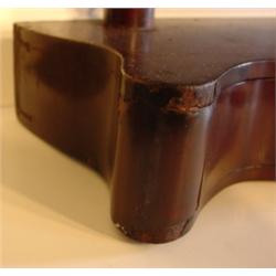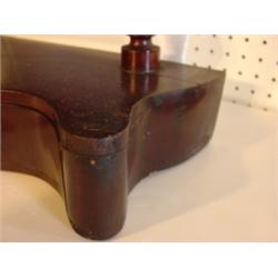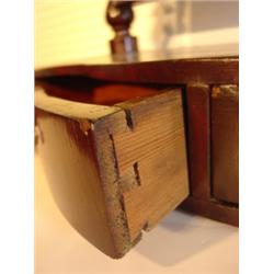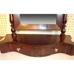 WALNUT 2 DRAWER SHAVING MIRROR. Serpentine front. Dovetailed drawers. Original glass knobs on drawers. Missing several pieces of veneer on drawer fronts and top edge and bottom edge of base. 25.5" H, 20.5" W, 7.5" D