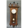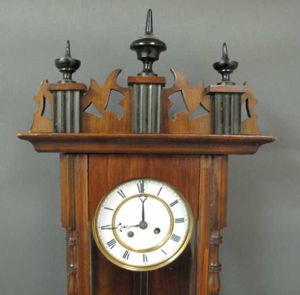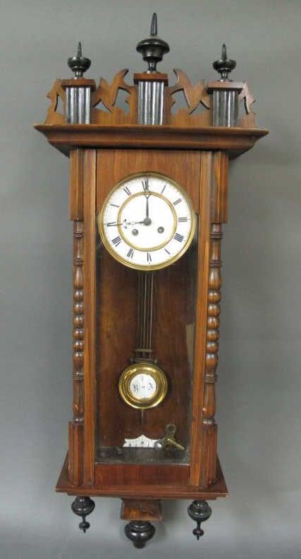 -with glass front and porcelain face. clock has finials to top and bottom.