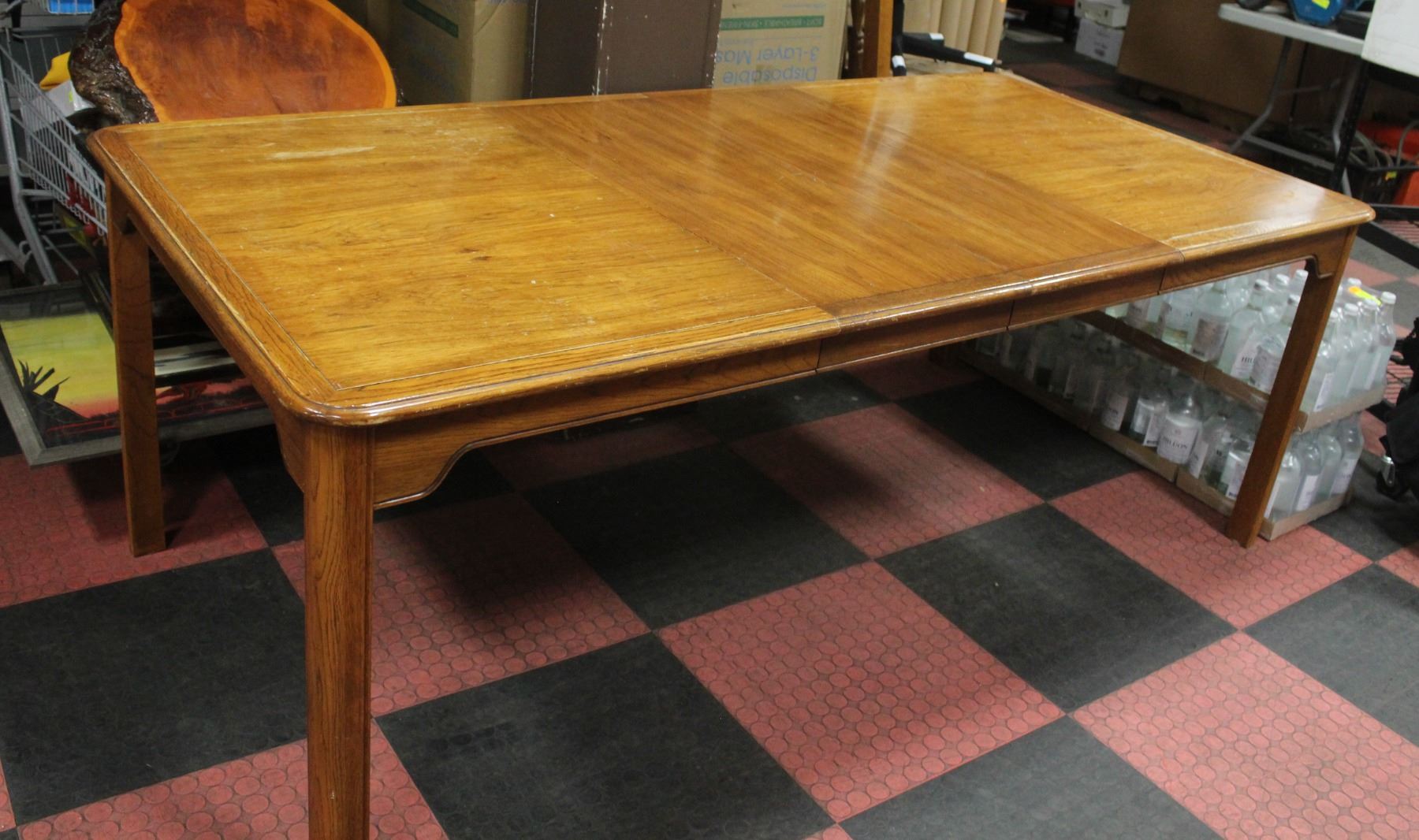 DINING TABLE WITH TWO EXTENSION LEAFS **ALL ITEMS MUST BE REMOVED BY 5PM FRIDAY, SEPTEMBER 2ND, 2022. ALL REMAINING ITEMS WILL BE SUBJECT TO A $6.00 PER DAY STORAGE CHARGE. ANY ITEMS REMAINING AFTER FRIDAY, SEPTEMBER 2, 2022 WILL BE CONSIDERED FORFEITED. NO REFUNDS WILL BE ISSUED FOR FORFEITED ITEMS.** TO SCHEDULE A PICK UP APPOINTMENT. CLICK HERE