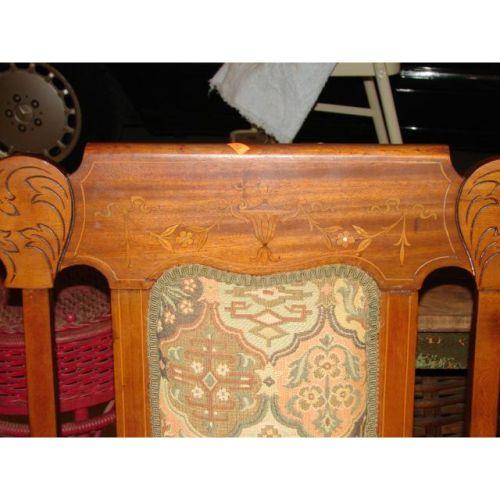 WALNUT EASTLAKE ARMCHAIR. Has vine & urn inlaid & mother-of-pearl decoration at back crest with a padded and upholstered back rest. 39” H to top of back, 24” W