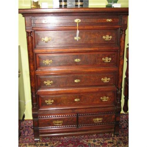 A VERY HANDSOME AMERICAN EASTLAKE STYLE CHEST OF DRAWERS MADE IN WALNUT CA 1880. THIS CHEST CONSISTS OF A NARROW LONG DRAWER ON THE TOP, FOUR LARGER LONG DRAWERS UNDERNEATH AND TWO SMALL DRAWERS ON THE BOTTOM. IT IS IN VERY GOOD CONDITION WITH GOOD BURL MARKINGS TO THE DRAWER FRONTS AND THE FRONT COLUMNS. ALL THE BRASS HARDWARE APPEARS TO BE IN GOOD CONDITION AND IN KEEPING WITH THE STYLE OF THE CHEST. THE CHEST HAS ITS ORIGINAL CASTORS.