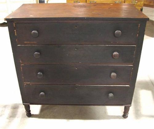 WALNUT FOUR DRAWER CHEST. Four graduated dovetailed drawers. Turned feet at front. Wooden drawer knobs. Shows loss of veneer at drawer fronts and excessive water staining at top. 39.75” H, 41.5” W, 20.5” D
