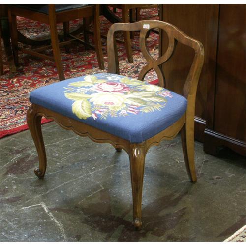 VANITY CHAIR: Walnut French Provincial vanity bench, cabriole legs, floral needlepoint seat.