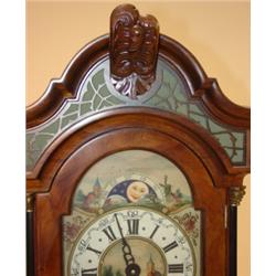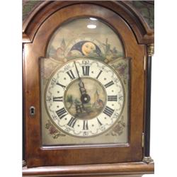 Walnut grandmother's clock with Bombay shaped base. Painted dial, decorated with columns on top of hood. Custom made. 74.5" H, 16" W