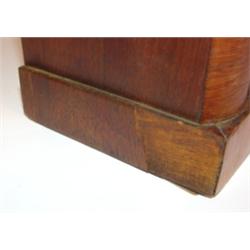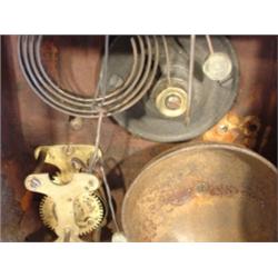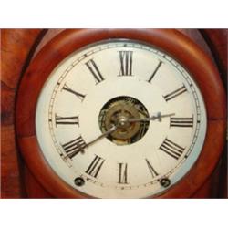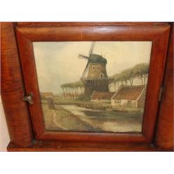 WALNUT MANTEL CLOCK. Painted cardboard decoration of windmill behind glass on bottom door. Missing veneer on lower left side measuring 1.5" L. Slight wear and crazing to dial. Replaced strike. Marked behind works with illegible paper label. Has pendulum & key. 18.75" H