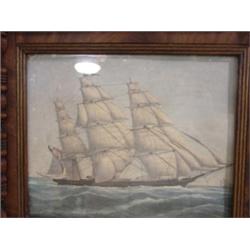 WALNUT WALL MIRROR WITH SHIP PRINT AT TOP. Circa 1820. Turned edging. 17.25" x 33.75"